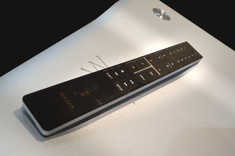 K přístroji dostanete dálkový ovladač, který vypadá jako dlouhá leč hranatá kouzelnická hůlka. Kromě toho, že se díky štíhlému tvaru a ostrým hranám docela blbě drží, mají povely z ní i mírnou latenci, takže než jsem si zvyknul, často jsem stlačil tlačítko znovu, než se stačil vykonat předchozí povel a uvedl tak přehrávač do stavu zmatení. Je to ale jen věc adaptace na způsob ovládání, za chvíli se přizpůsobíte. Druhou a firmou preferovanou možností je ovládat Studio Player pomocí aplikace v chytrém telefonu. Wadax nespí, a tak do přehrávače přicházejí i v době psaní této recenze nové aktualizace (stahuje si je a instaluje si je sám). Takže tlačítko na dálkovém ovladači pro rychlý posun vpřed, které ještě včera nefungovalo, po dnešní aktualizaci už funguje. Doufám, že se dočkáme i dalších užitečných vylepšení, například možnost vidět numericky zbývající čas skladby, zapnout ovladačem repeat, nebo ovládat menu přehrávače z poslechového křesla. V době, kdy jsem spisoval tento text, to je možné jen vkleče prstem na dotykovém 5-palcovém kapacitním displeji. Ten je jednoduchý a monochromatický (přebaly alb jsou samozřejmě vidět v barvě), takže neruší a jeho rozvržení svými křivkami kopíruje křivky celého šasi. Vypadá to opravdu hezky, pokud nepotřebujete číst informace na displeji z dálky větší než 2 metry – znaky jsou opravdu malé. Pak je lepší použít appku.