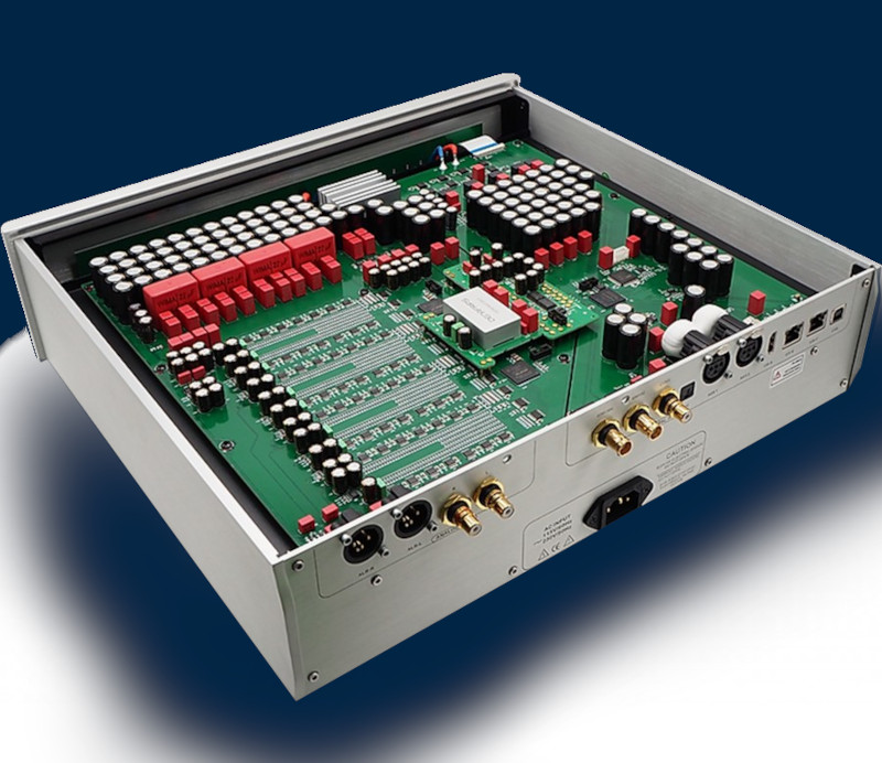 Oba R2R žebříky jsou od sebe kvůli snížení šumu izolované, řídí je však společný zdvojený OCXO oscilátor, který si bere signál z FIFO bufferu a hodiny operují na frekvencích 45,1584 MHz a 49,152 MHz. Všechno je opět odstíněné vlastním kovovým pouzdrem a napájené svým zdrojem. O napájení analogové části a digitální části se starají dva velké transformátory s O-jádrem.